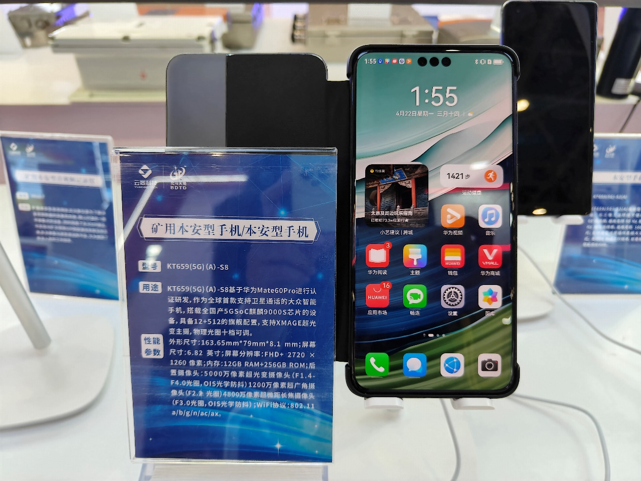 第一款,基于华为Mate 60 Pro为原型开发的矿用本安型手机KT659(5G)(A)-S8,该手机适用于煤矿井下含有爆炸性气体的环境,其屏幕具有高自适应刷新率和触控采样率,为用户带来极致的视觉享受。手机不仅支持双向卫星通信、星闪技术,同时可结合北斗天地矿鸿家族产品实现“一碰连”“一碰传”等矿鸿多设备协同功能,可以灵活应对矿山复杂的信息处理需求,满足不断变化的业务场景,大幅提升作业效率和生产力。