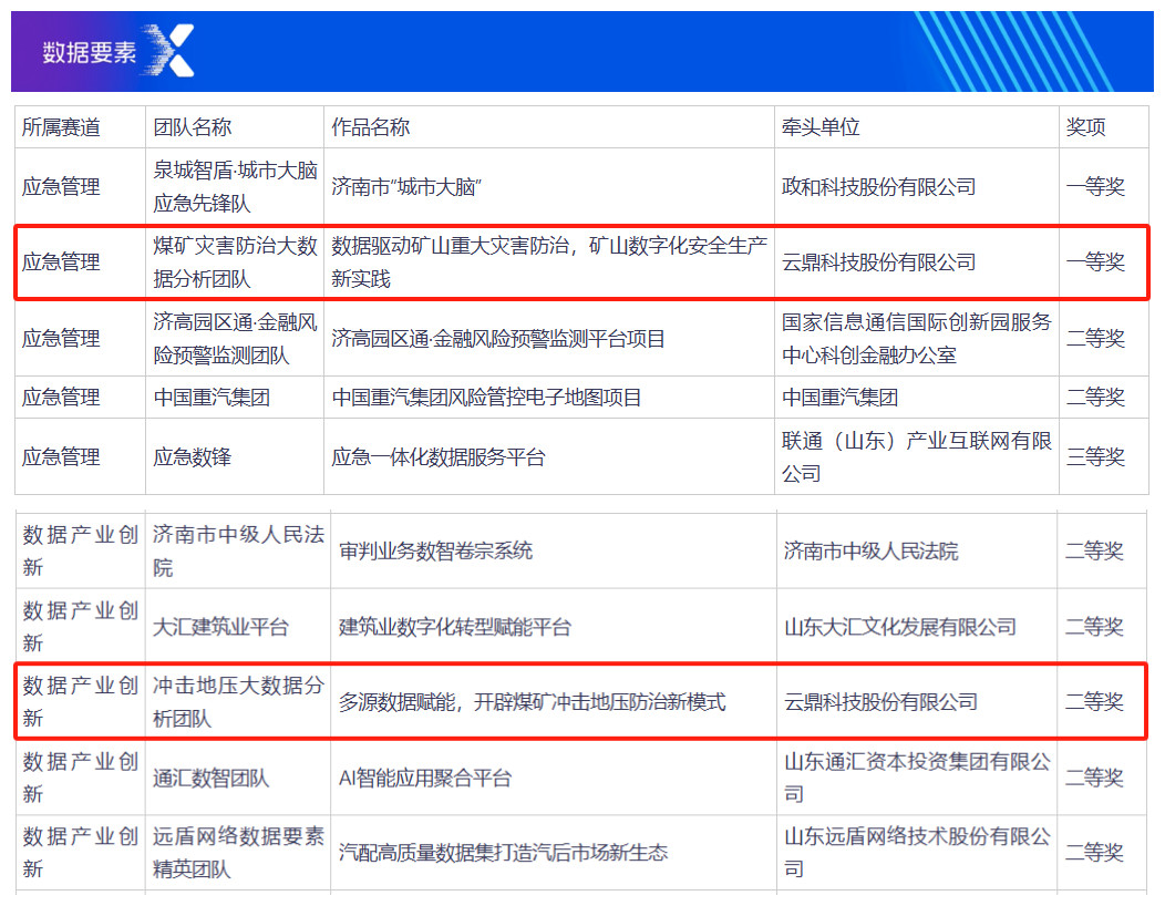 近日,2025年“数据要素×”大赛山东分赛济南市选拔赛获奖名单公布,云鼎科技凭借深厚的技术积累与卓越的行业应用表现,从180余支精锐参赛队伍中脱颖而出,一举将“应急管理赛道一等奖”与“数据产业创新赛道二等奖”收入囊中,彰显了公司在数据要素市场化领域的领先地位。