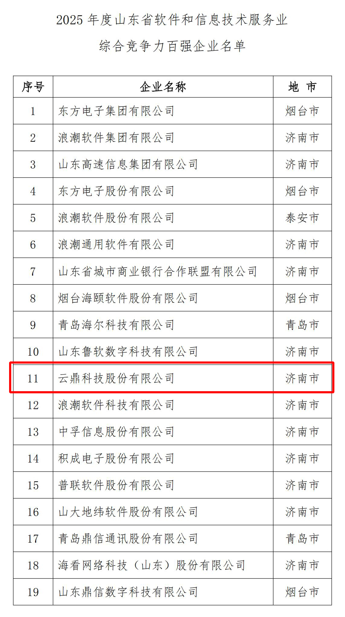 近日,山东省软件行业协会正式发布“2025年度山东省软件和信息技术服务业综合竞争力百强企业”榜单,云鼎科技凭借过硬技术实力与行业影响力强势入选,位列第11名,旗下权属公司山能数科同步上榜,位居第45名。此项殊荣不仅是对公司综合竞争力的高度认可,更充分彰显了其在软件与信息技术服务领域的领先地位与创新活力。