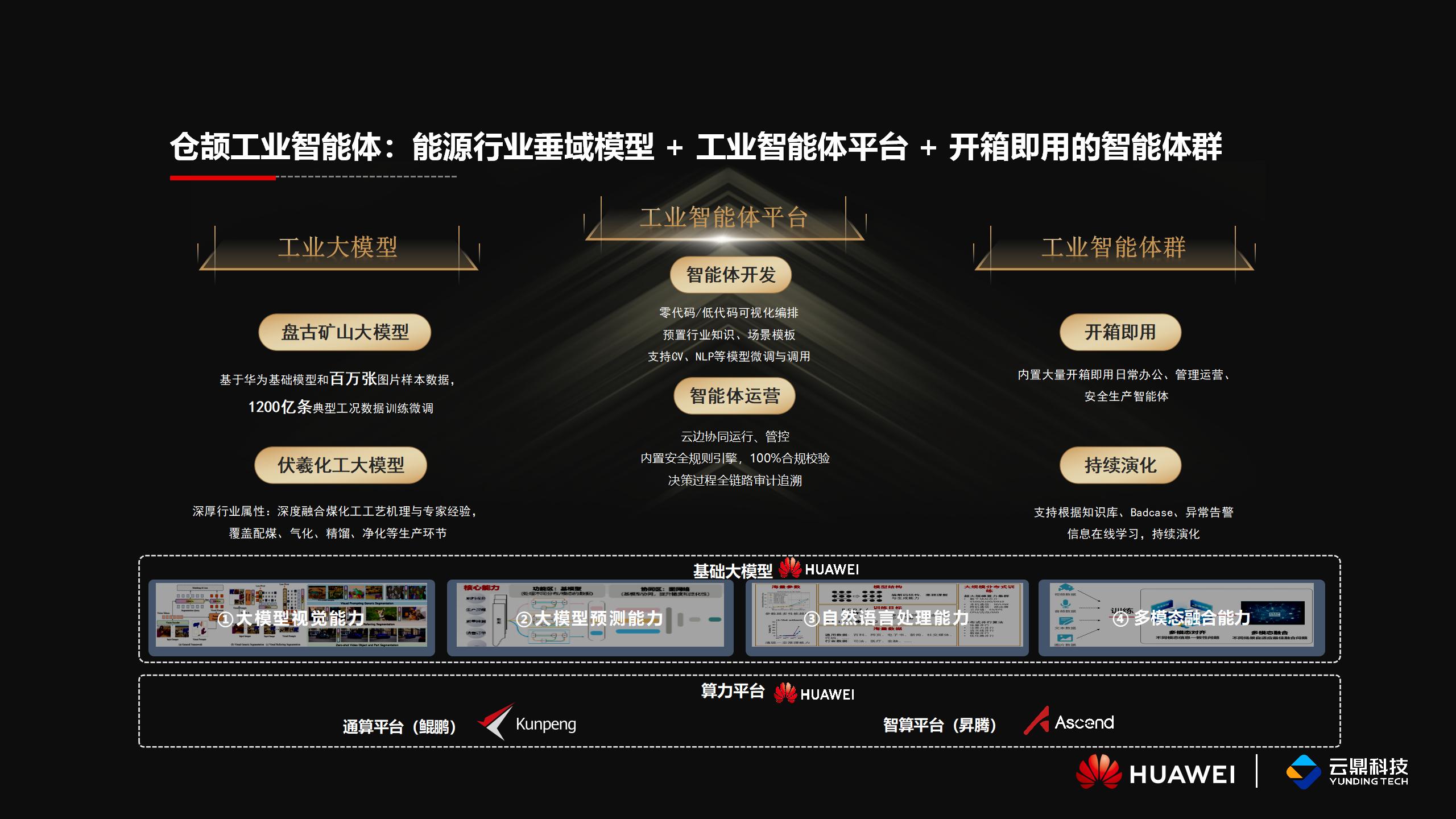 依托能源行业高质量专属数据集,创新应用多层次多粒度数据对齐与结构化数据融合寻优理论,深度研发盘古矿山、伏羲化工两大垂域大模型;构建AI大模型与机理模型深度融合的预测大模型训练框架,突破传统“先建模、后应用”的研发模式,打造覆盖视觉感知、智能预测、自然语言处理及多模态融合的工业大模型生态。